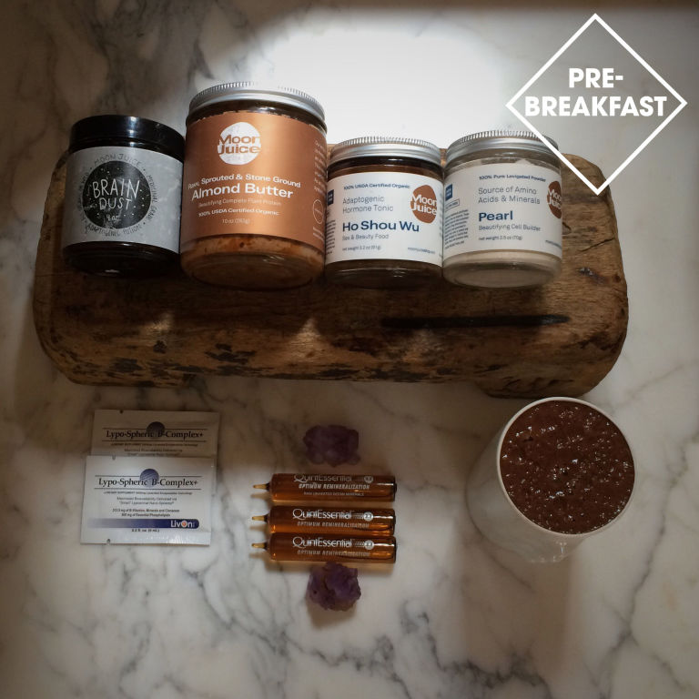 "At 8am, I had a warm, morning chi drink on my way to the school drop off, drunk in the car! It contains more than 25 grams of plant protein, thanks to vanilla mushroom protein and stone ground almond butter, and also has the super endocrine, brain, immunity, and libido- boosting powers of Brain Dust, cordyceps, reishi, maca, and Shilajit resin. I throw ho shou wuand pearl in as part of my beauty regime. I chase it with three quinton shots for mineralization and two lipospheric vitamin B-complex packets for energy."