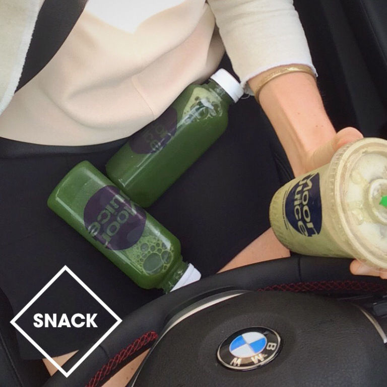 "Today I also called into Moon Juice and got some 'drive through.' Work doesn't keep me in the shop like it used to. Sadly I'm always on the go and running late, so I usually call in a mid-workday curbside pick-up. I grabbed a mint chip hemp milk with double servings of maca and sprouted brown rice protein, sweetened with stevia, as well as two Goodness Greens juices."